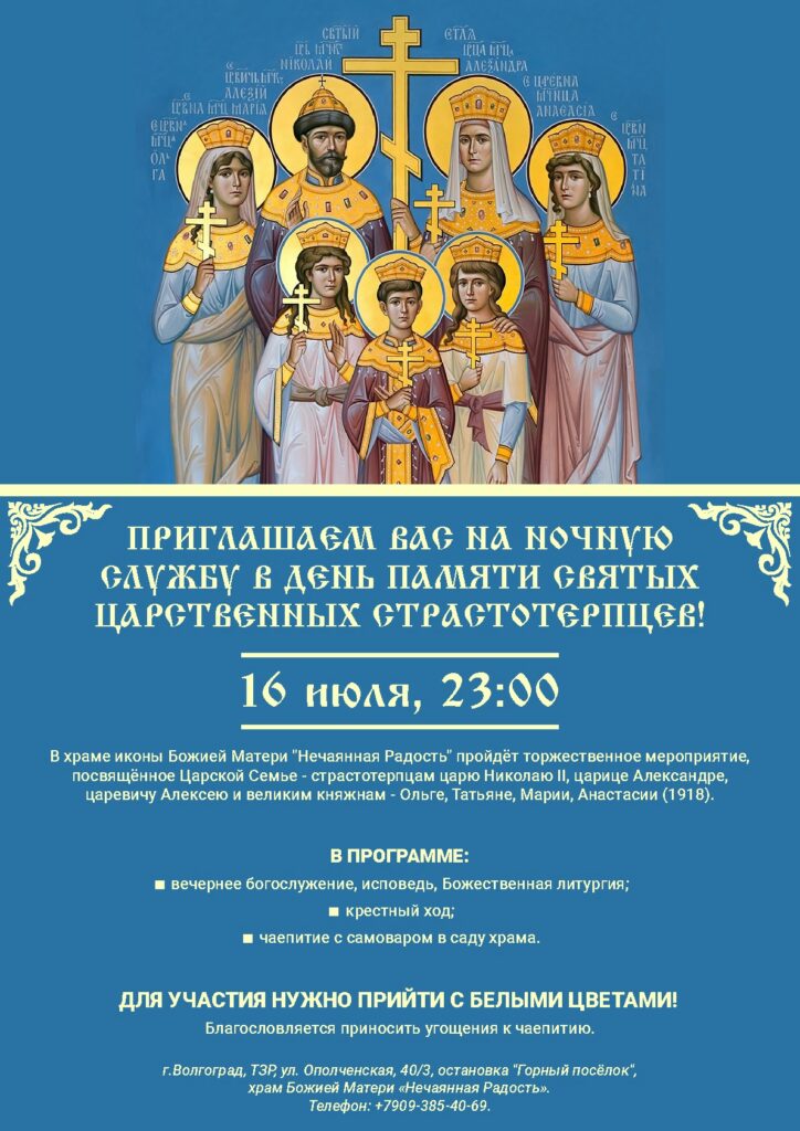 16 июля в 23:00 в храме иконы Божией Матери «Нечаянная Радость» пройдёт торжественное мероприятие, посвящённое Царской Семье — страстотерпцам царю Николаю II, царице Александре, царевичу Алексею и великим княжнам — Ольге, Татьяне, Марии, Анастасии (1918).